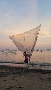 One morning in Amed I came across a fisherman on the beach, he was running along the shoreline with his makeshift push net to catch fish. As the light reflected on him and the calm sea, I couldnβt help but feel a deep sense of appreciation of the humble connection that exists between man and the ocean. An appreciation for the effort that it takes for this man to catch his bounty to bring food to the table. And an appreciation for the ocean for providing the gift of life itself